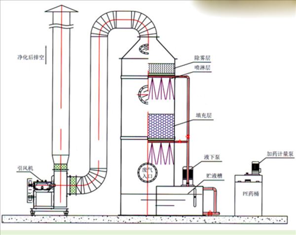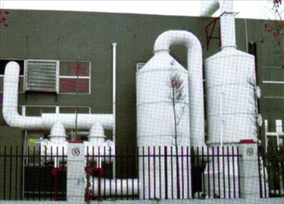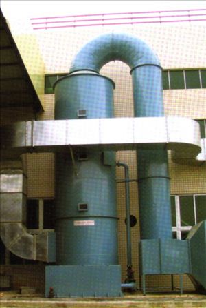廢氣由風機壓入凈化塔的鈞壓室,經(jīng)過不等速回式的噴霧處理進入內(nèi)塔處理器,廢氣穿過由新穎鮑爾環(huán)組成的填料層,進入二道噴霧處理,使氣液兩相充分接觸,發(fā)生中和反應,然后經(jīng)過脫液處理排入大氣,凈化后的廢氣達到國家規(guī)定的標準。