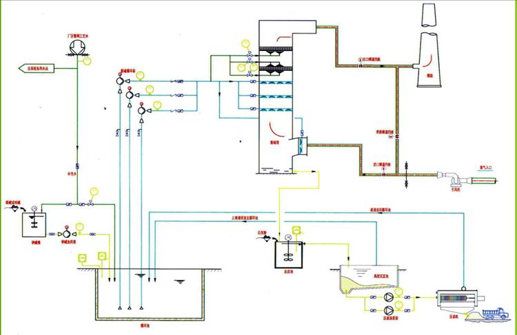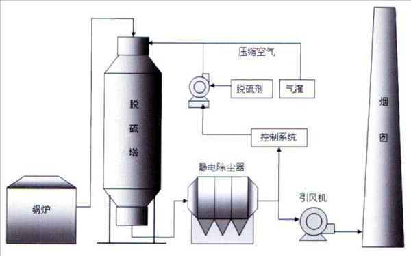 煙氣進(jìn)入特制的裝有雙流霧化器塔,脫硫液由貯槽經(jīng)給液泵,與壓縮空氣混合后進(jìn)入塔中并發(fā)生復(fù)雜的物理化學(xué)反應(yīng),脫硫液中堿性物與煙氣中S02、02反應(yīng)生成硫酸鹽。煙氣熱量使脫硫液中的水分全部汽化,反應(yīng)后的氣再經(jīng)干式除塵器除塵后,由煙囪排放。